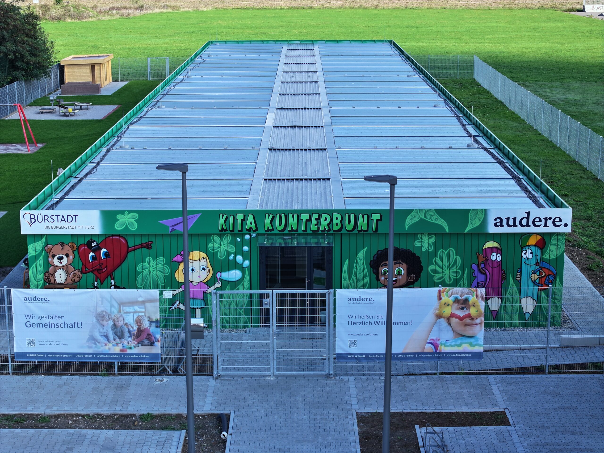 Nach zwei Jahren Übergangszeit im Bürgerhaus Riedrode hat die Einrichtung nun ihr neues, maßgeschneidertes Zuhause in einer modernen Raummodulanlage gefunden. Das Gebäude besticht durch eine farbenfrohe, kindgerechte Fassadengestaltung, die bereits von Weitem eine einladende Atmosphäre schafft. Im Inneren sorgen bodentiefe Fenster mit Jalousien für helle, lichtdurchflutete Räume.