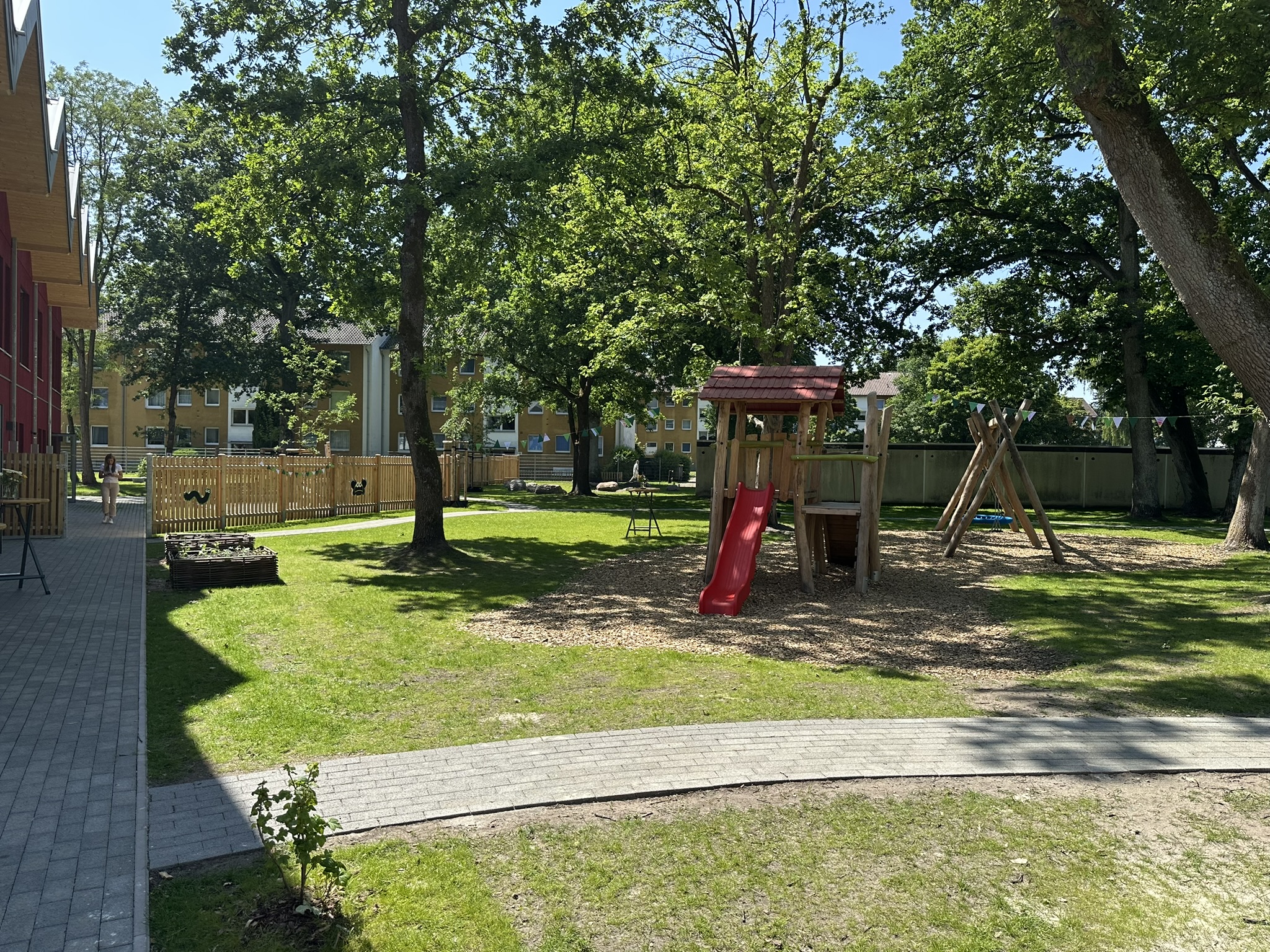 Die CO₂-reduzierte Holzbauweise in Verbindung mit einem auf die KiTa-Nutzung spezifisch ausgerichteten Energiekonzepts sichert die Zukunftsfähigkeit des Gebäudes. Für eine sehr gute Energieeffizienz sorgen insbesondere die Kombination aus Photovoltaik, Luft-Wärme-Pumpe und Steuerungselektronik (Nachtauskühlung). Eine große Außenspielfläche bietet darüber hinaus ein altersgerechtes sowie abwechslungsreiches Bewegungs- und Spieleangebot.